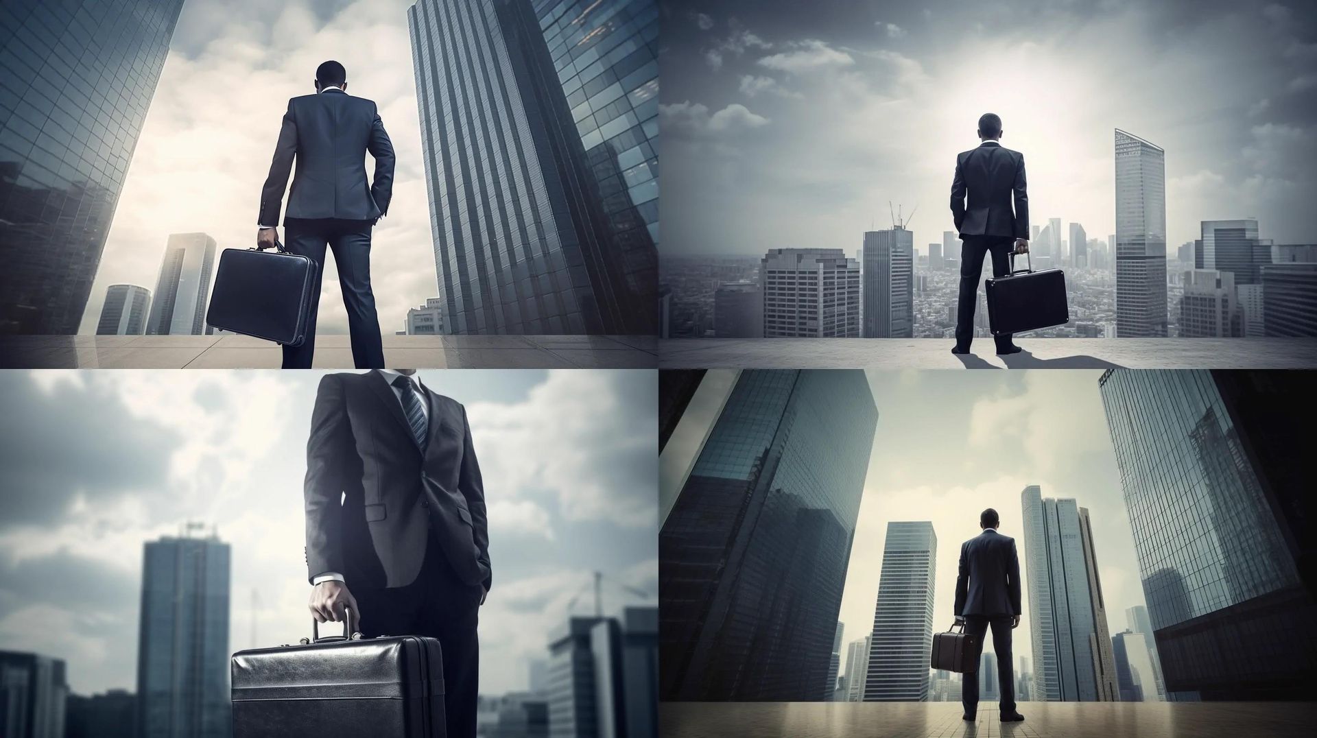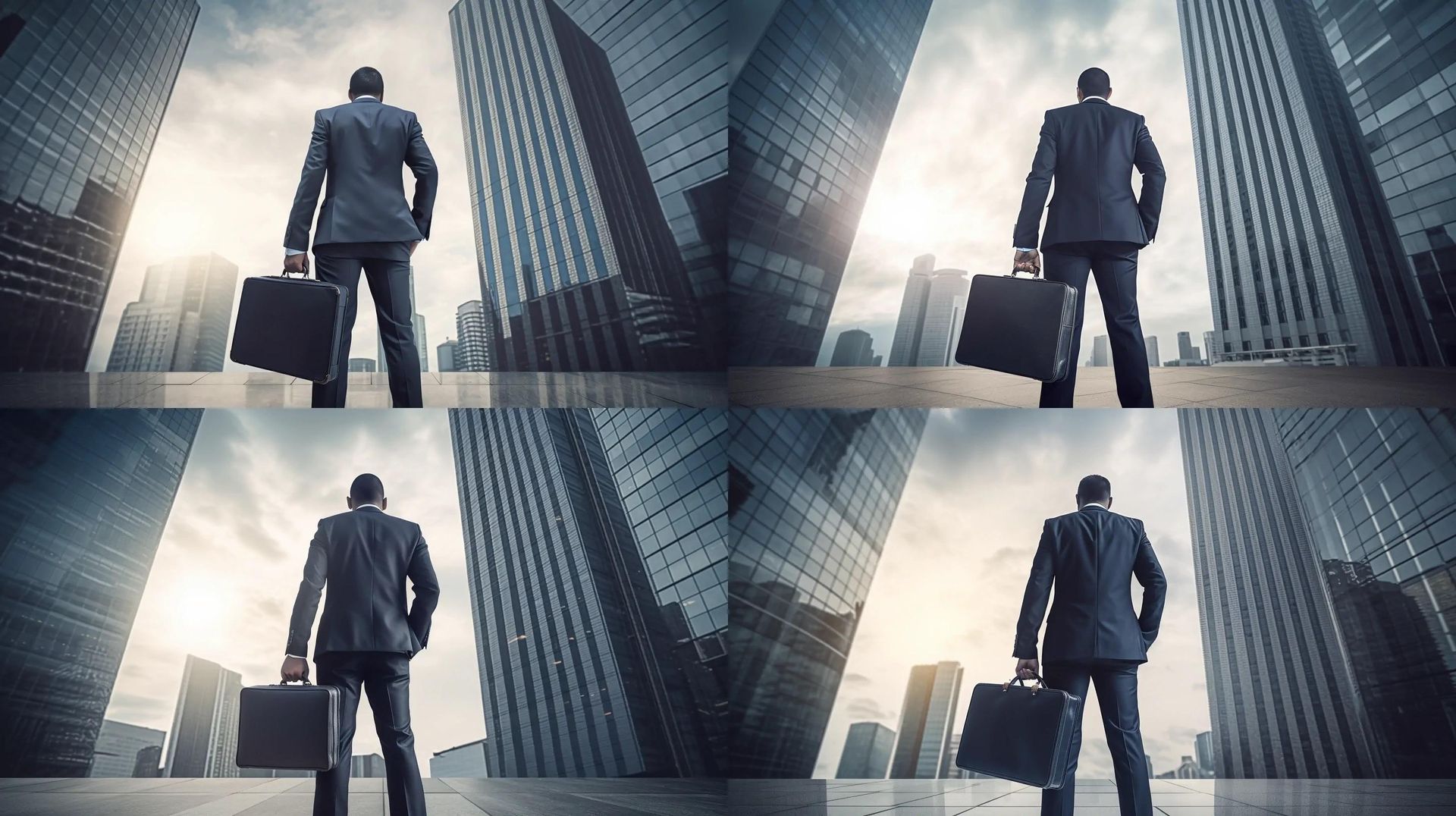 prompt: A man in a suit with a briefcase, standing in front of a skyscraper, stock image style, the whole body of the figure is presented, --ar 16:9